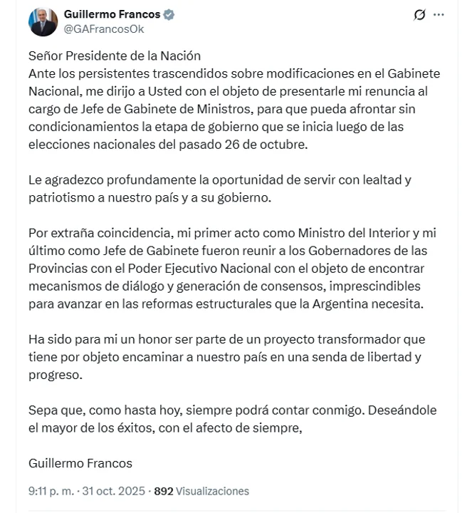 En su carta, Francos explicó que su salida busca que Milei pueda "afrontar sin condicionamientos la etapa de gobierno que se inicia" tras los comicios.
