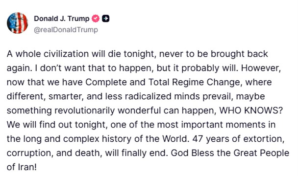 Así lo expresó Trump en su cuenta oficial de Truth Social: “Esta noche morirá toda una civilización, para no volver jamás. No quiero que eso suceda, pero probablemente ocurrirá”.
